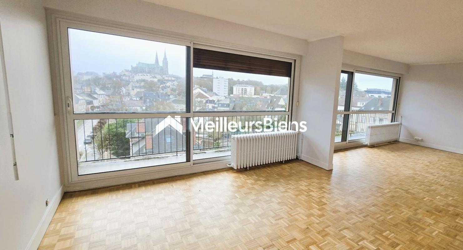 Alexandre COLLO vous propose ce bien :L'agence POURMONBIEN by Alexandre COLLO est heureuse de vous proposer ce magnifique appartement entièrement rénové, comme neuf avec une vue incroyable sur la cathédrale et la basse ville. Idéalementsitué au sein d'une résience entretenue, à pieds de la Gare et à proximité immédiate du centre-ville, des commerces et des écoles. cet appartement est situé au 5ème et dernier étage .Entièrement rénové en 2025 ce bien lumineux bénéficie d'une exposition plein sud, offrant une belle clarté toute la journée. Vous profiterez d'un vaste séjour de 34 m², idéal pour une pièce de vie conviviale, prolongé par un balcon agréable. La cuisine aménagée et équipée, est fonctionnelle et moderne, prête à l'emploi. La partie nuit se compose de 2 chambres confortables, d'une salle de bain et de rangements optimisés, permettant un aménagement facile .Deux cave privatives viennent compléter ce bel appartement, apportant un espace de stockage supplémentaire très pratique. POssibilité de garage en sus.Ce 4 pièces rénové, au dernier étage, avec balcon, cave, ascenseur et toutes les commodités à pied, représente une opportunité rare sur le marché chartrain. Idéal pour une résidence principale confortable ou un investissement de qualité, contactez nous rapidement au 07.66.71.28.28 ! Dans votre intérêt, votre agence c'est POURMONBIEN.\nLes informations sur les risques auxquels ce bien est exposé sont disponibles sur le site Géorisques : www.georisques.gouv.fr