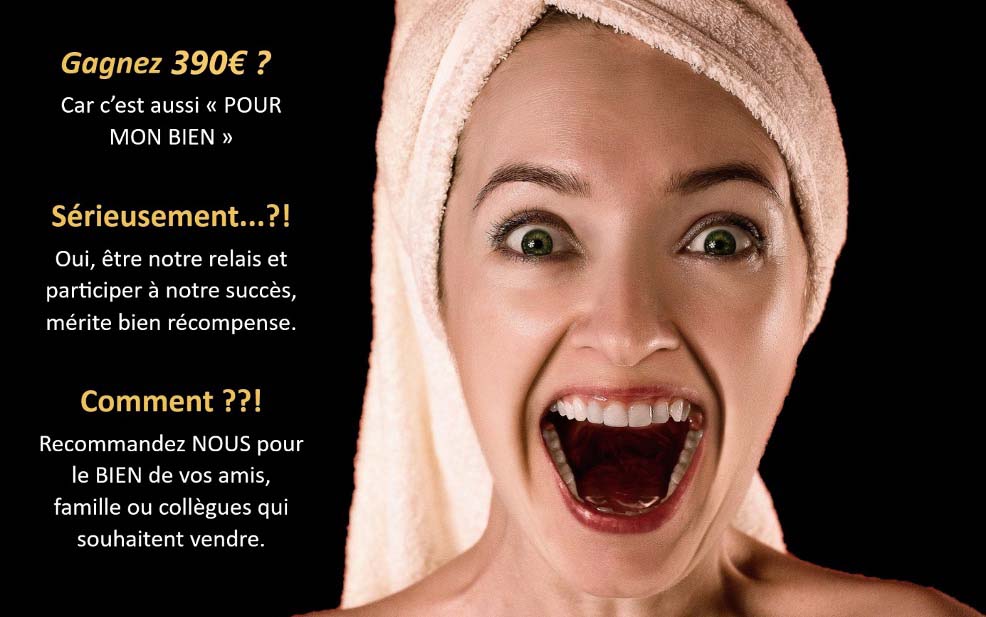 • Vous touchez alors 390 € sur les honoraires de l’agence POUR MON BIEN, sous forme de Bons Cadeaux après la signature de l’acte de vente.